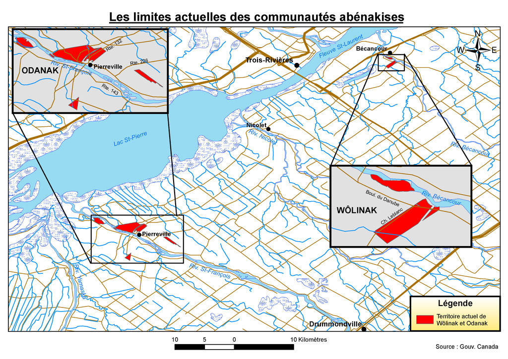 Today, most Abenaki are grouped in two separate communities: Odanak and Wôlinak, both of which are located on the south shore of the St. Lawrence River, between Sorel and Trois-Rivières. These two villages — sometimes called reserves — have access to services offered by their respective band councils, as well as by the Grand Council of the Waban-Aki Nation in Wôlinak. The Grand Council provides technical services (architecture, building mechanics), consulting services (financial management, band administration), social services (child and family services) and home support (help with daily activities, in-home respite). It also provides communication tools (community newspapers, press relations), as well as services in translation, land claims and consultations, hunting, fishing, computing and geomatics (map-making). Members of the Abenaki First Nation living outside Odanak and Wôlinak can also benefit from these advantages and services as long as they are connected to one of the two villages.