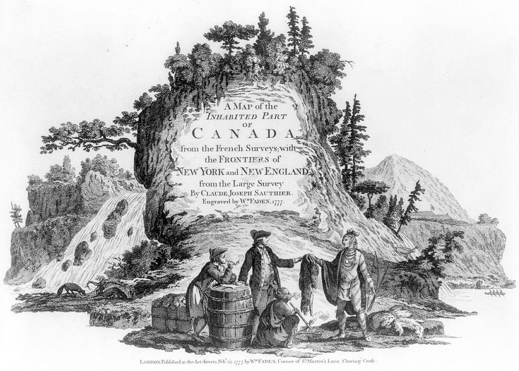 • Illustration noir et blanc de deux Européens échangeant des biens avec deux autochtones au pied d'une montagne et d'un cours d'eau.