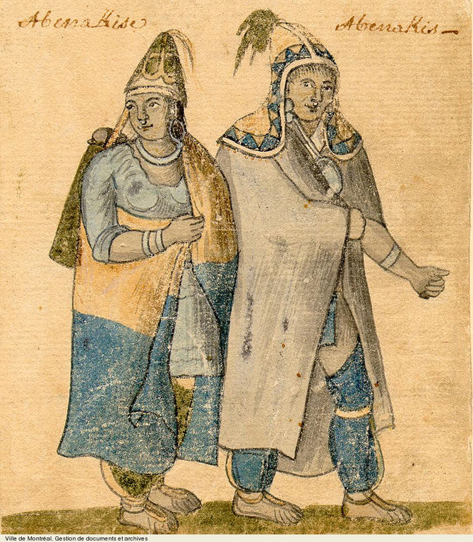 • Dessin de deux Abénakis vêtu de vêtements de tissus. Tous deux portent des chapeaux en pointe.