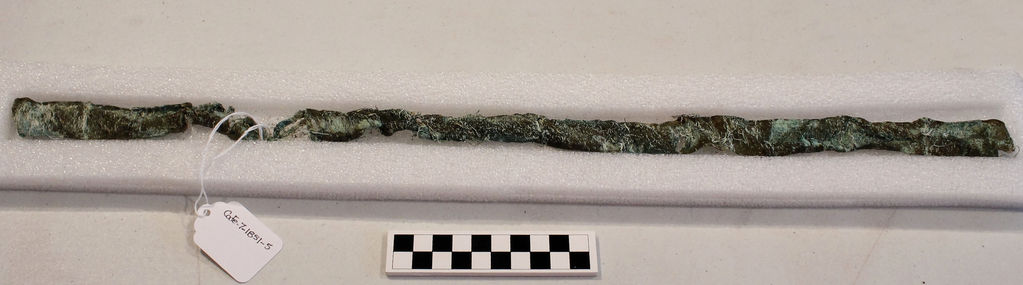 • Photographie couleur d'un ruban verdâtre en tissu et en fils de cuivre.