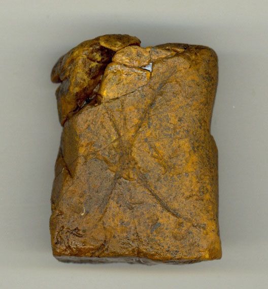 • Photographie couleur d'une pièce d'argilite jaune, de forme rectangulaire, une croix y est gravée.