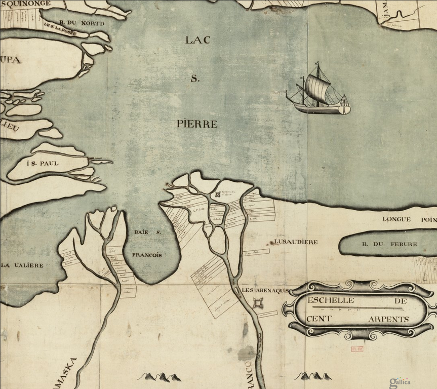 • Carte du lac Saint-Pierre démontrant une partie de la rivière Saint-François. Les forts Crevier et d'Odanak sont localisés.