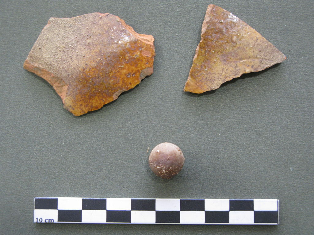 • Photographie couleur de deux tessons de terre-cuite de couleur orangée et une balle de fusil en plomb.