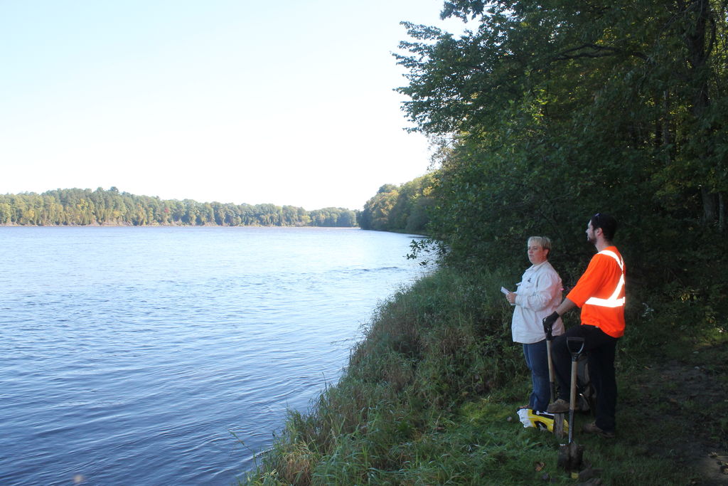 • Photographie couleur d'un homme et d'une femme près d'une rivière, tous deux tenant une pelle.